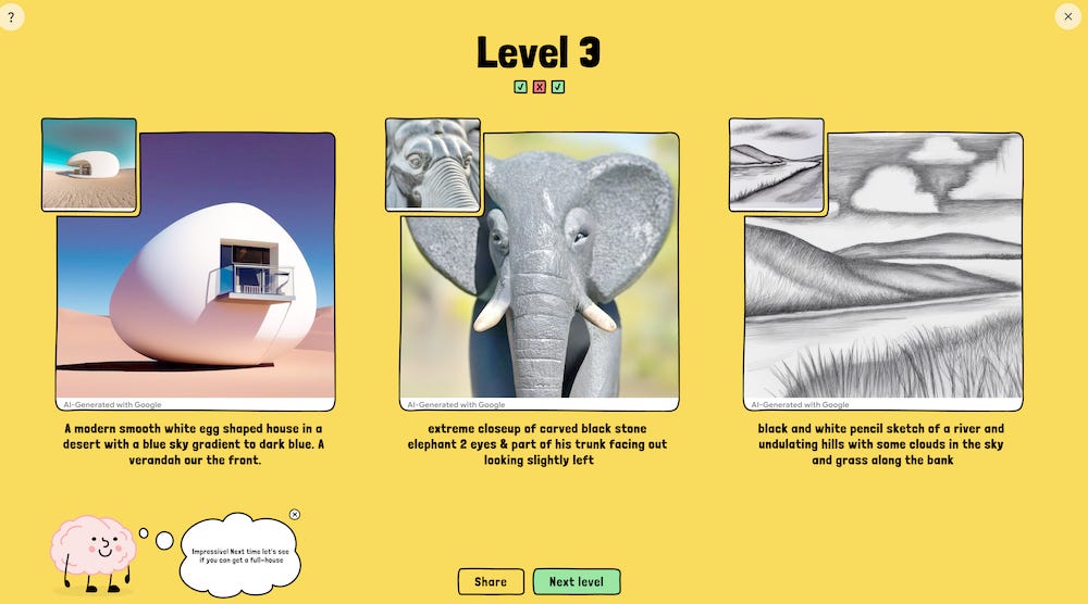 This helps students see why experimenting with descriptors, adjectives & settings matters when creating images.