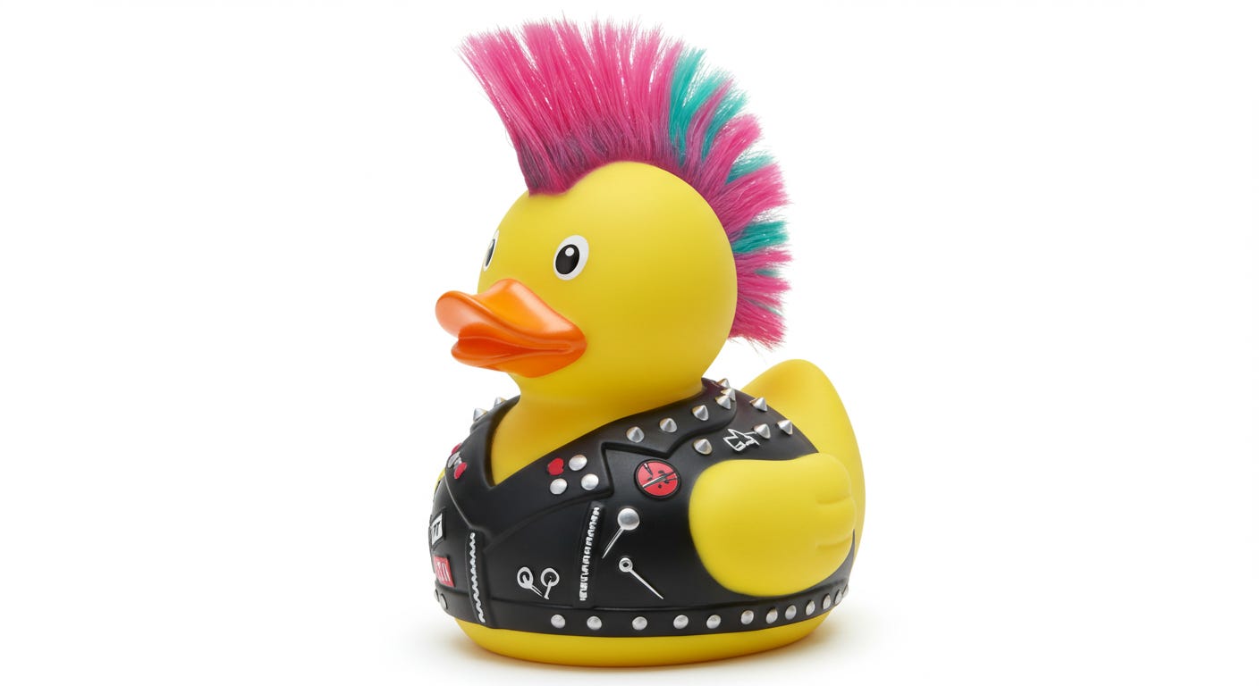 “A bright yellow rubber duck styled as a punk rocker, wearing a black leather vest covered in studs, safety pins and patches. The duck has a spiky mohawk hairstyle in vibrant pink with teal streaks. The duck’s expression is bold and playful, combining the cute look of a toy with edgy punk fashion. White background, high-resolution studio lighting.”