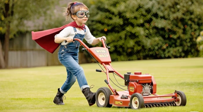 Here’s Sally, she imagines zooming through the backyard with a Webb Wasp Lawn Mower wearing goggles and a cape.